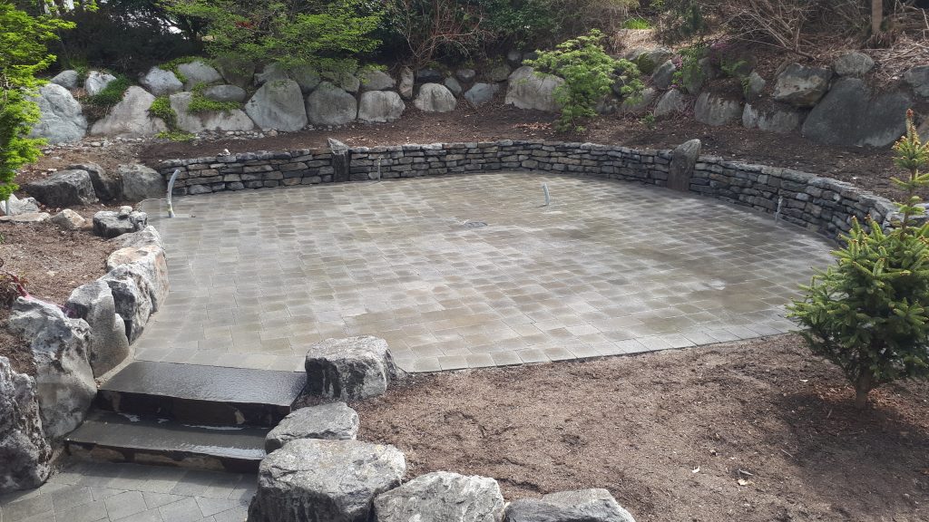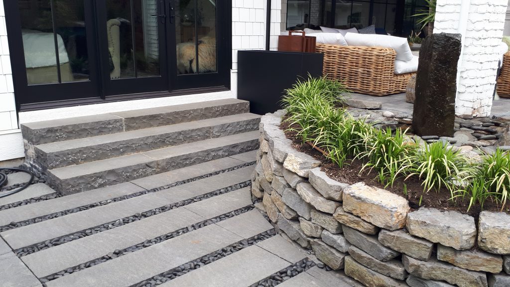 Our Hardscape Landscaping services include Bobcat and excavation for site preparation, drainage, and block retaining walls. We specialize in interlocking paving stone driveways, patios and pathways, as well as Basalt stone walls and steps.